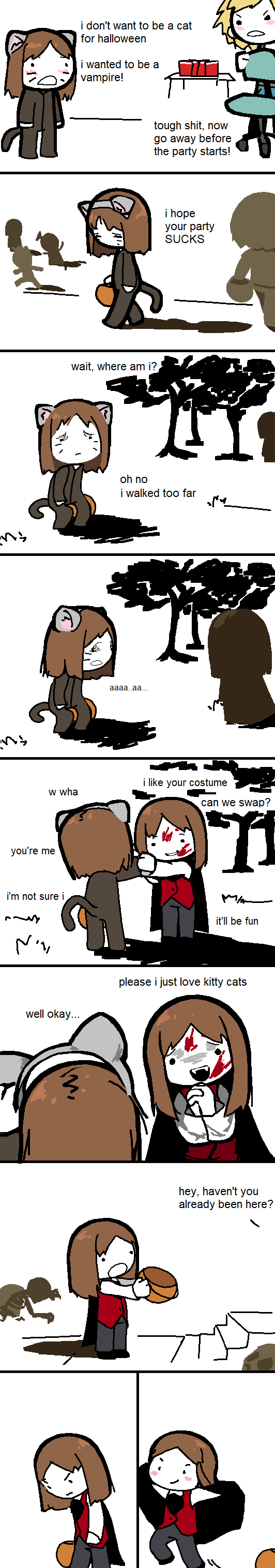 Hello again everyone, it's been a while! I hope you've all been well, and that you all enjoy this comic I made in the spirit of Halloween, which doesn't always go as planned, but can still end up being something to appreciate. It reads left to right, and I think my favorite part of how it turned out is probably how the doppelganger looks while saying "kitty cat". For now, take care, and see you next year! (just a joke!)